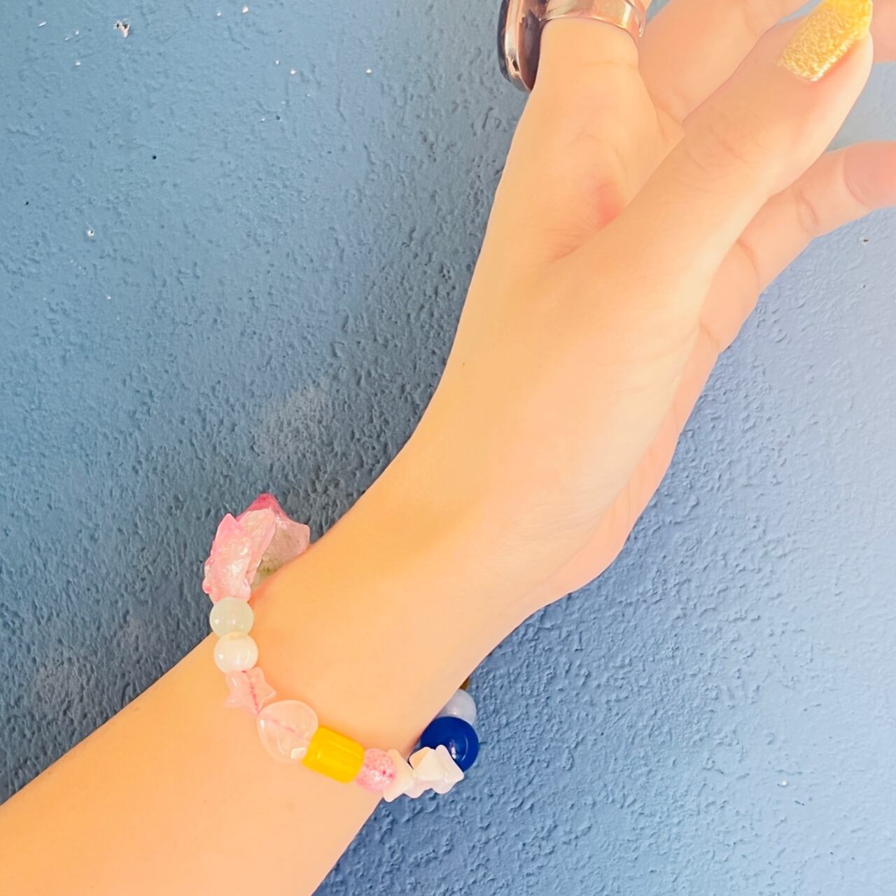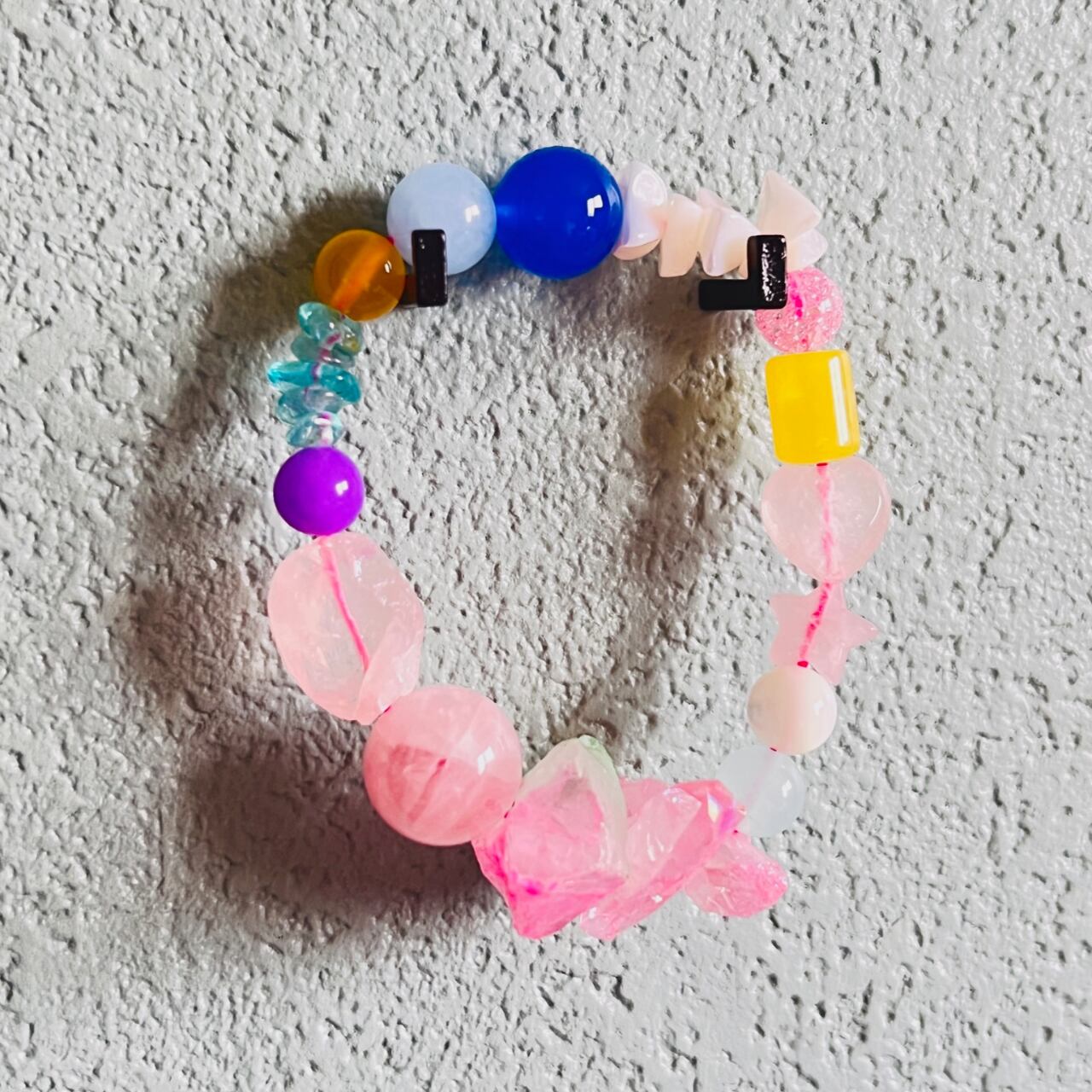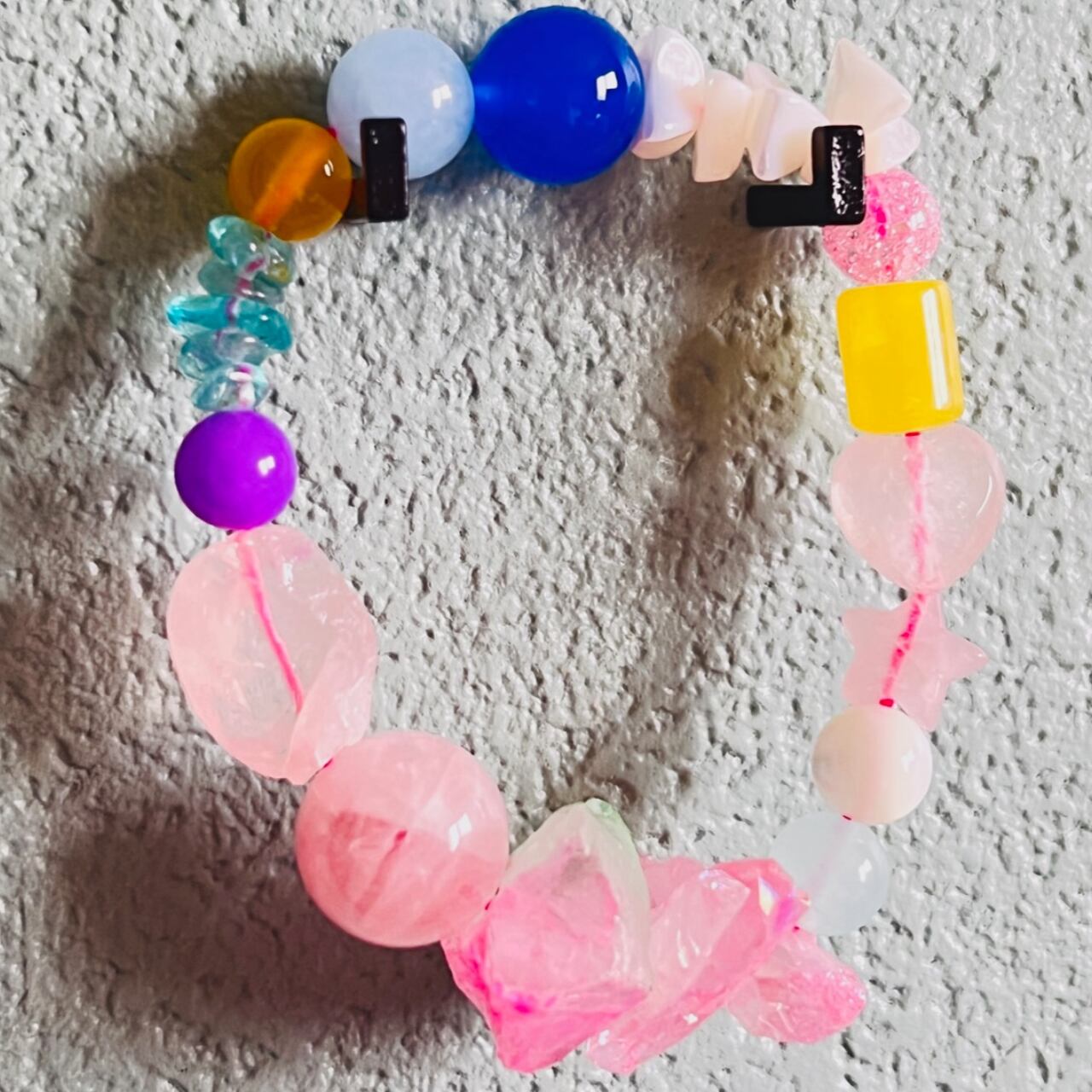 淡いピンクカラーにビビッとカラーのビーズを合わせたオリジナルデザイン。