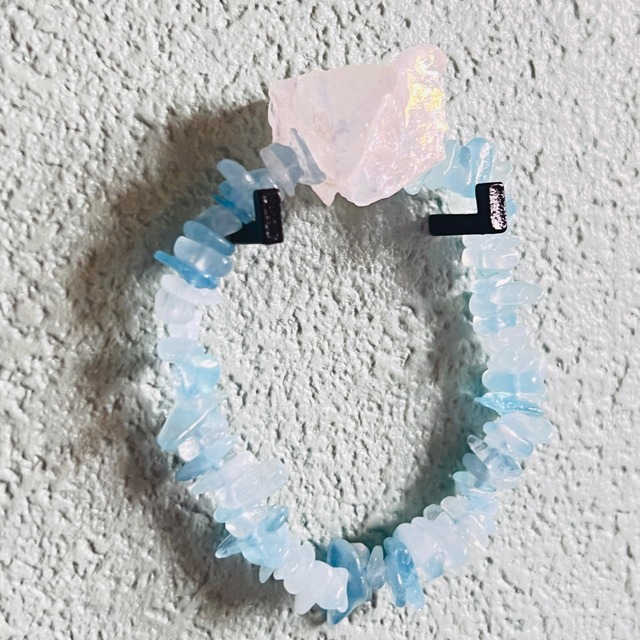 シンプルなデザインで季節問わず使用しやすいオーラカラークリスタルとアクアマリンの涼しげ爽やかブレスレット。