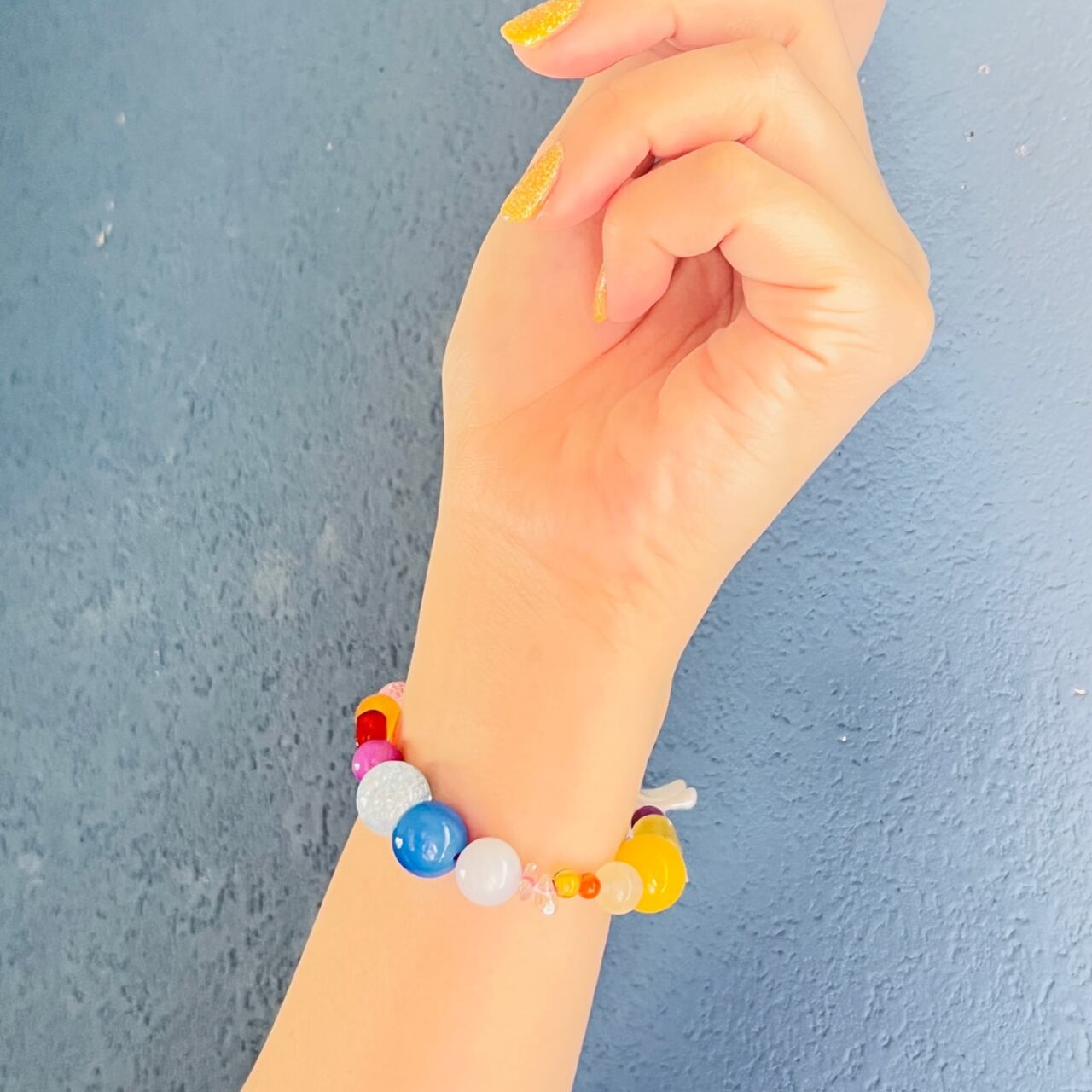 形もカラーもバラバラで個性的なデザインブレスレット。