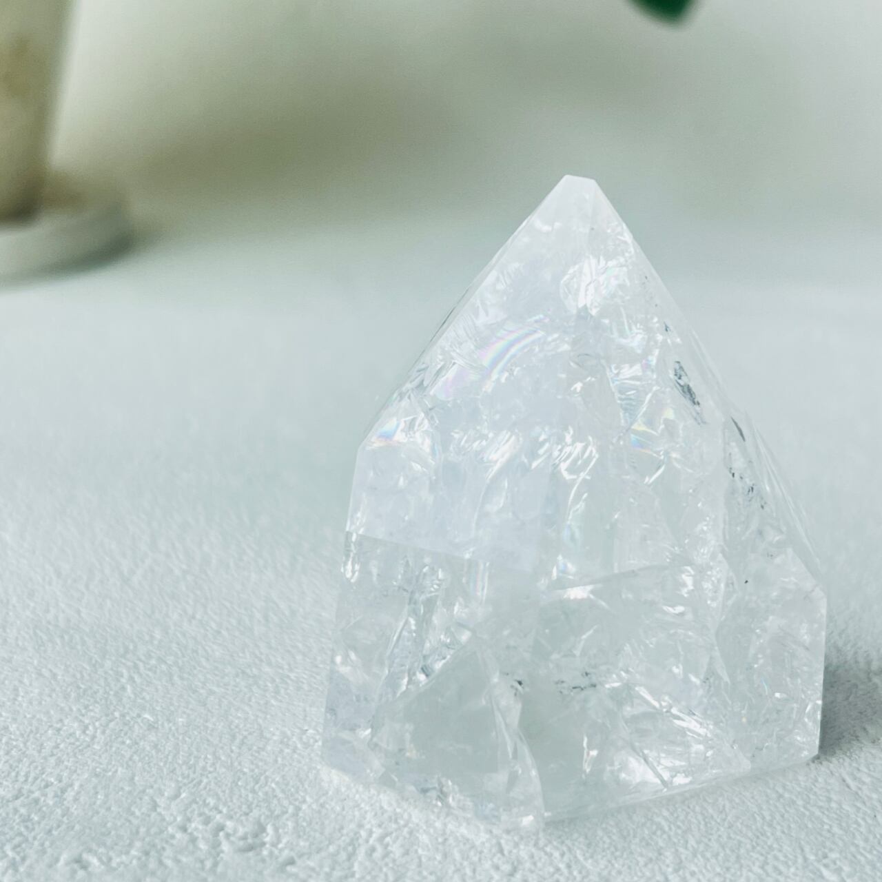 ブラジル産水晶ならではの美しい透明感と表情豊かなインクルージョンが楽しめるクラック水晶ポイント。