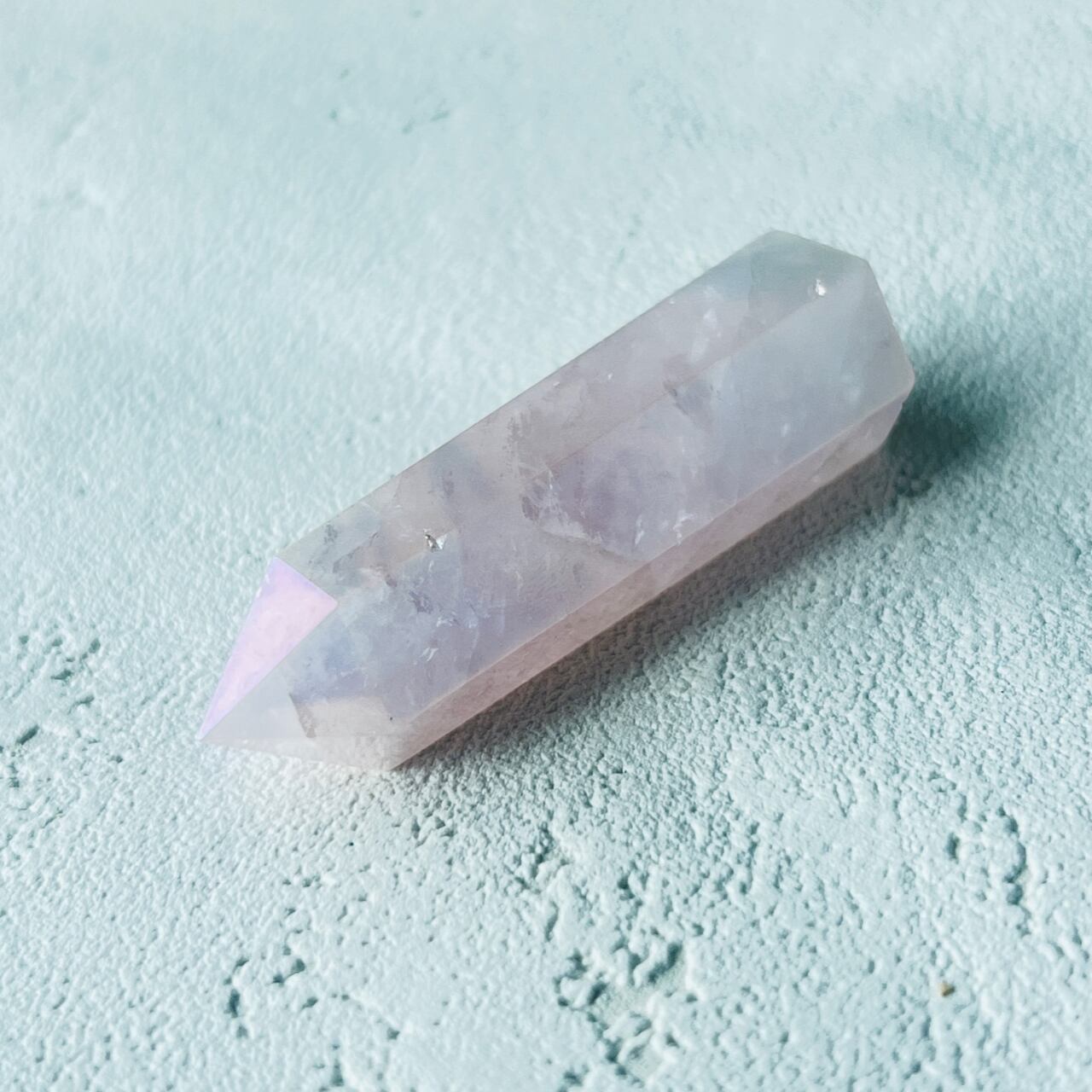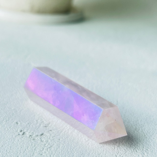 こちらはローズクォーツに金属を蒸着させた優しい色合いのオーラクォーツです。