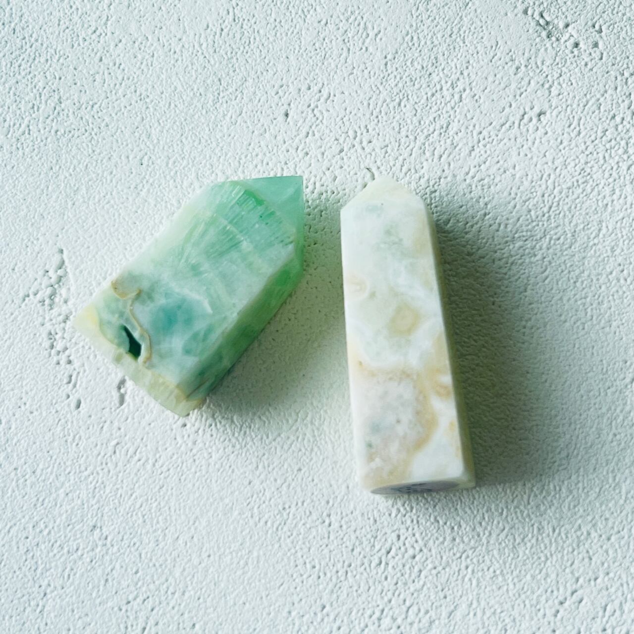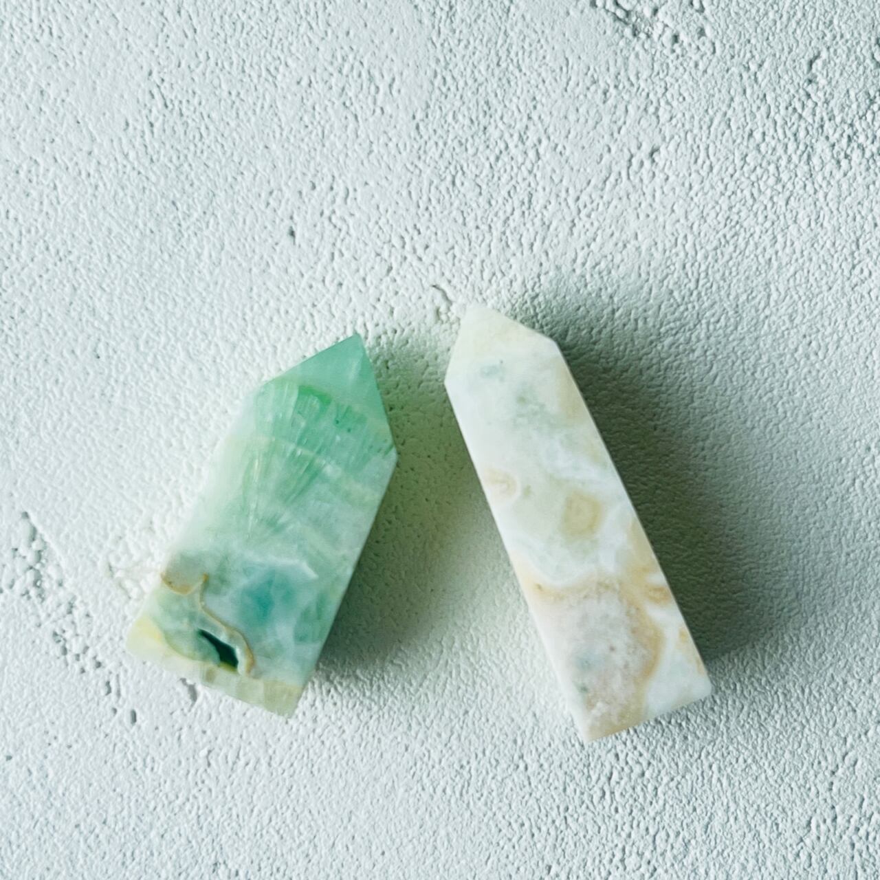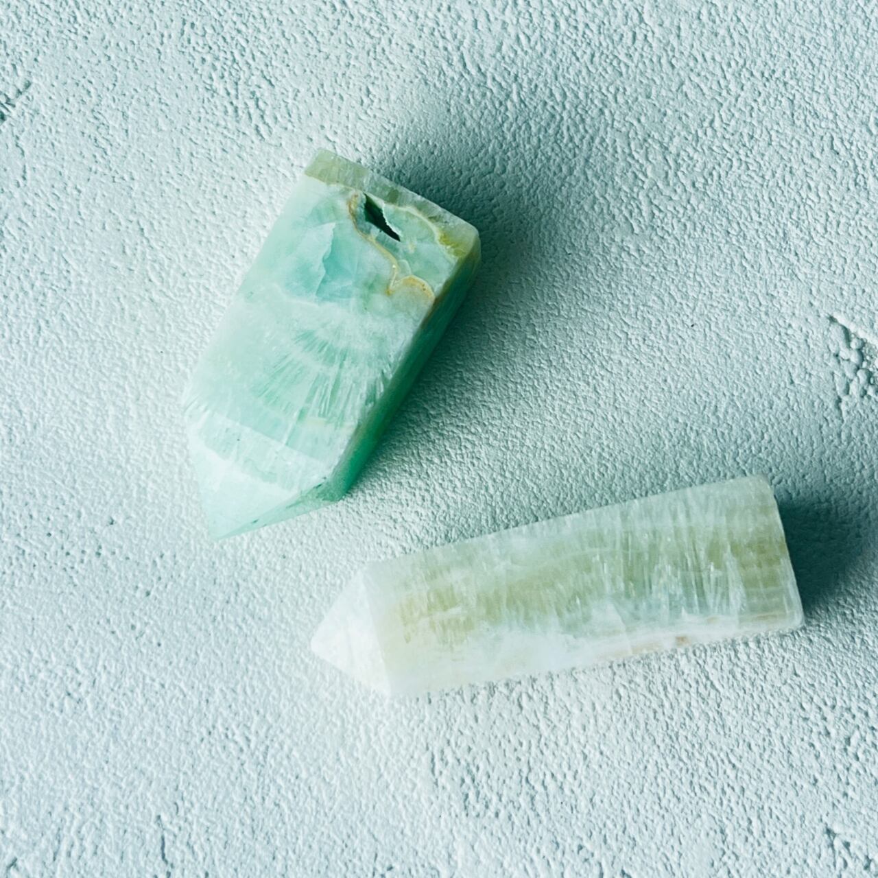 優しく爽やかなカラーがかわいらしいオベリスク型のピスタチオカルサイト。